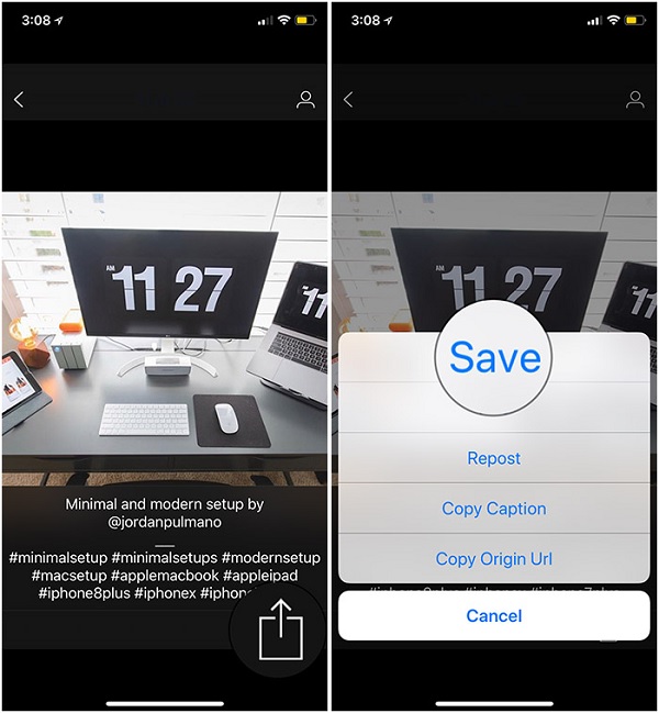 – Bước 4: Quan sát nút chia sẻ ở góc dưới cùng bên phải rồi nhấn vào đó. Tiếp theo nhấn “Save” là hoàn thành xong việc lưu ảnh từ Instagram về iPhone.