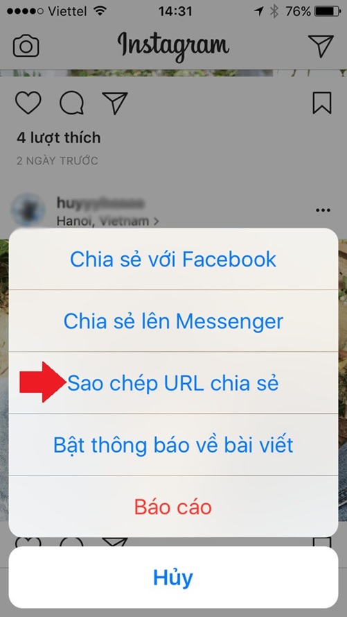 – Bước 1: Tìm đến phần 3 chấm trong bài đăng mà bạn muốn tải ảnh. Nhấn vào nút 3 chấm đó rồi chọn “Sao chép URL chia sẻ”.