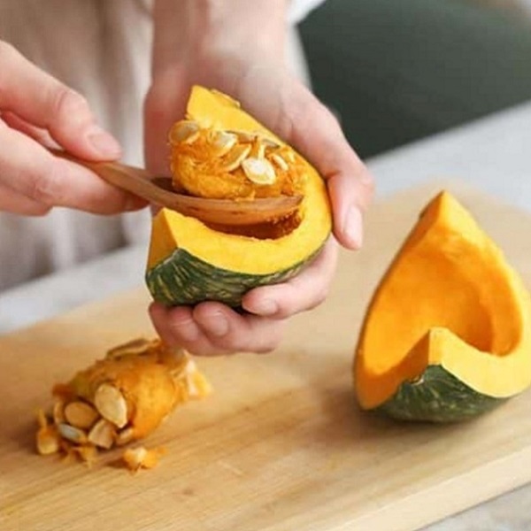 Bước 2: Bí ngô gọt bỏ sạch vỏ và phần lõi rồi đem rửa sạch lại với nước và cắt thành miếng nhỏ.