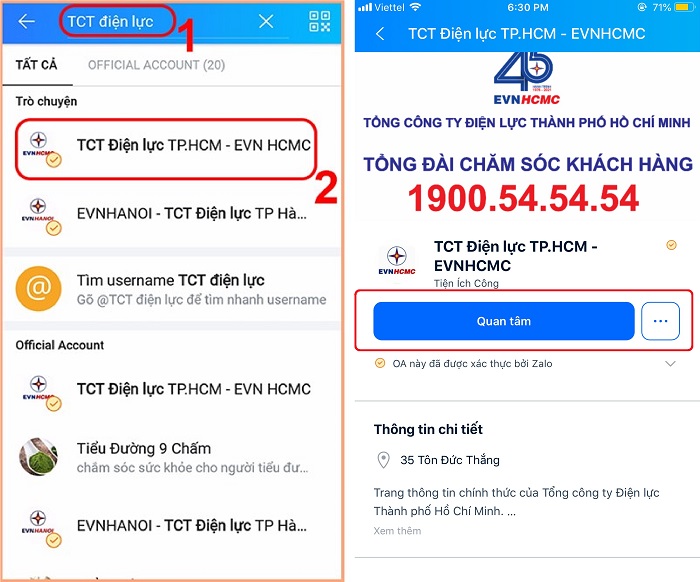 Bước 1: Bạn mở ứng dụng Zalo, rồi tiến hành nhập từ khóa “EVN + Khu vực” trong mục tìm kiếm hoặc chọn trực tiếp vào kết quả hiển thị. Sau đó nhấn nút “Quan tâm”.