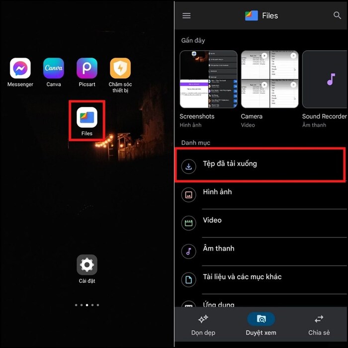 Bước 1: Vào ứng dụng Files trên điện thoại Android. Sau đó nhấn vào phần Tệp đã tải xuống.