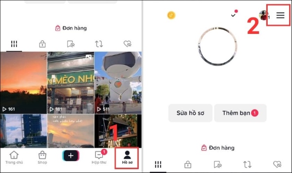 Bước 1: Tại giao diện chính của ứng dụng TikTok trên điện thoại, bạn chọn Hồ sơ. Chọn tiếp biểu tượng 3 thanh ngang phía trên để vào Cài đặt.