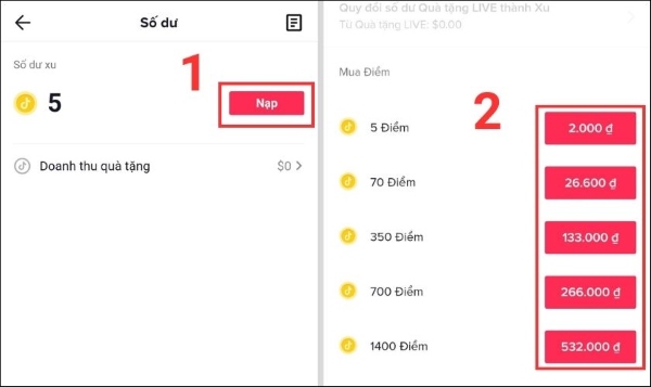 Bước 3: Nhấn Nạp rồi chọn số điểm cần mua xu.