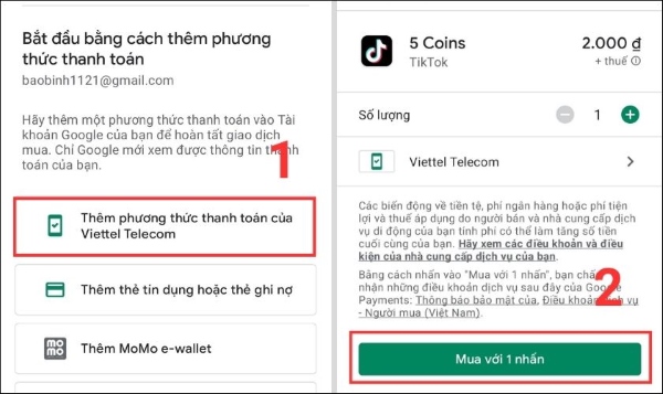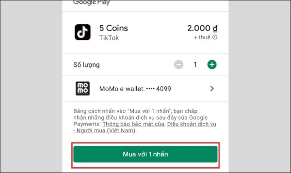 Sau đó bạn lần lượt thực hiện các thao tác trên màn hình rồi chọn Mua với 1 nhấn để hoàn tất cách nạp xu TikTok.
