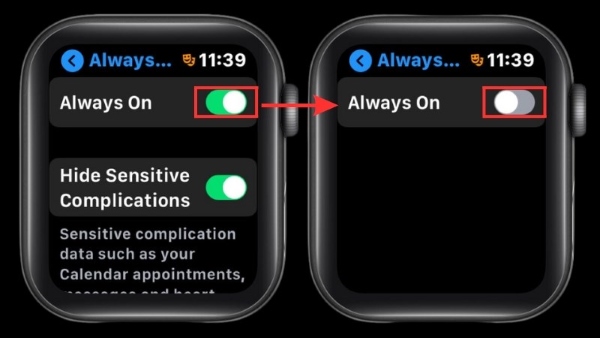 Màn hình Apple Watch từ Series 4 trở về trước sẽ chỉ hiển thị khi người dùng cử động cổ tay hoặc nhấn nút Digital Crown. Tuy nhiên, kể từ Series 5 trở đi, Apple Watch đã được trang bị tính năng màn hình luôn sáng Always-On. Tính năng này mặc dù mang lại sự thuận tiện, nhưng cũng ảnh hưởng đến tuổi thọ pin và thời gian sử dụng thiết bị.