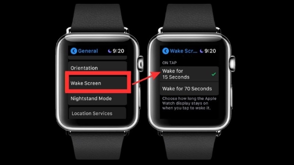 Theo cài đặt mặc định, màn hình Apple Watch sẽ tự tắt sau 15 giây nếu bạn không có bất ky hoạt động nào. Tuy nhiên, bạn có thể điều chỉnh thời gian hiển thị màn hình sáng này tối đa lên 70 giây với tùy chọn “On Tap”. Nhưng khi màn hình sáng lâu hơn sẽ đồng nghĩa với việc tốn nhiều pin hơn. Do vậy, để rút ngắn thời gian chờ đồng hồ tự động tắt màn hình, bạn làm như sau: