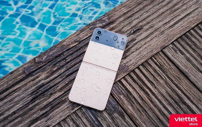 Tiếp đến, là phần khung nhôm Amor Aluminum của điện thoại sẽ được sóng bóng thay vì làm mờ như trước đây. Mặt lưng của Galaxy Z Flip4 cũng được hoàn thiện với chất liệu nhám mờ giúp việc cầm nắm tốt hơn và giảm đáng kể tình trạng bám bẩn trên phần mặt lưng. Chưa dừng lại ở đó, máy còn được trang bị chuẩn kháng nước IPX8, đây cũng là điện thoại đầu tiên được trang bị khả năng kháng nước. Giúp máy có thể tồn tại được dưới nước ở trong một khoảng thời gian.