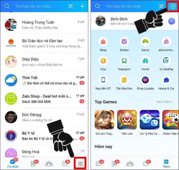 Bước 1: Đăng nhập ứng dụng Zalo và chọn vào mục Thêm. Sau đó chọn vào biểu tượng cài đặt hình bánh răng cưa.