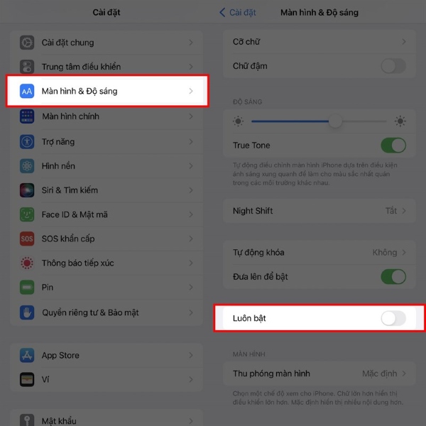Bước 2: Kéo xuống phía dưới, chọn mục Luôn bật >> chọn Bật hoặc Tắt tính năng AOD bằng cách kéo nút gạt sang phải hoặc sang trái là xong.