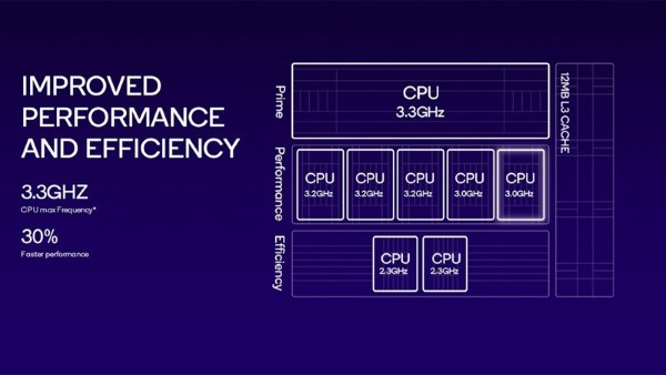 Bộ vi xử lý Snapdragon 8 Gen 3 được chế tạo dựa trên kiến trúc Kyro 8 nhân, bao gồm nhân chính Cortex-X4 xung nhịp 3.3GHz, cùng năm nhân hiệu suất Cortex-A720 gồm có ba nhân chạy ở mức 3.2GHz và hai nhân chạy ở mức 3.0GHz. Thêm vào đó là hai nhân tiết kiệm năng lượng Cortex-A520 chạy ở mức xung nhịp 2.3GHz, tạo ra một cấu trúc nhân xử lý khá đặc biệt là 1+5+2.