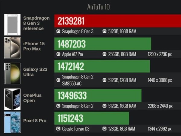 Bộ vi xử lý Snapdragon 8 Gen 3 cũng đã đánh bại phiên bản chip thế hệ mới Apple A17 Pro hoàn toàn về mặt hiệu năng, khi bộ vi xử lý từ Apple chỉ đạt 1.48 triệu điểm trên nền tảng kiểm tra AnTuTu 10.
