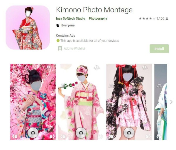 Kimono Photo Montage là phần mềm chụp ảnh của Trung Quốc theo phong cách truyền thống Nhật Bản, cung cấp một loạt các bộ trang phục cổ điển như áo Kimono, váy cưới kiểu Nhật, trang phục dành cho phụ nữ Nhật và những kiểu dáng thời xưa như thời đại Edo. Bạn chỉ cần chọn mẫu trang phục mình yêu thích, sau đó công cụ sẽ hỗ trợ bạn chèn khuôn mặt vào ảnh một cách tiện lợi và nhanh chóng.