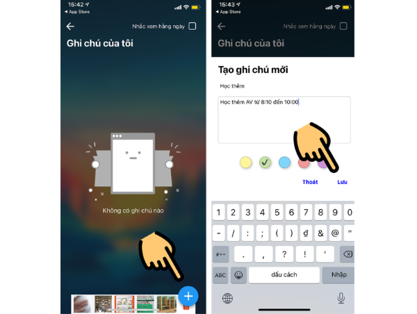 Bước 3: Chọn biểu tượng dấu + và nhập chi tiết ghi chú > Nhấn chọn Lưu là hoàn tất.