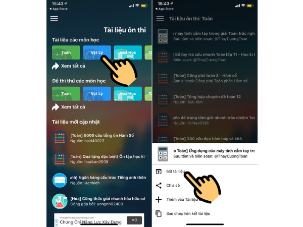 Bước 5: Chọn môn học > Chọn nội dung muốn xem > Nhấn tiếp vào Mở tài liệu để xem.