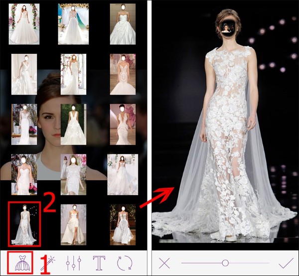 – Ghép ảnh dễ dàng: Chỉ cần vài thao tác đơn giản là có thể thay đổi các kiểu trang phục cô dâu tùy thích.