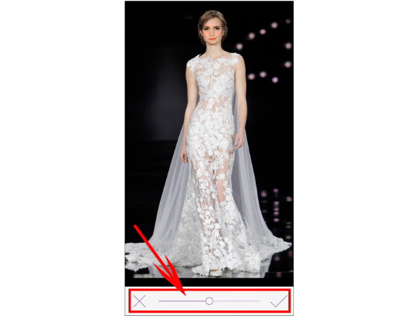 Bước 3: Khi đã căn chỉnh gương mặt hợp lý, bạn có thể thay đổi độ sáng của ảnh ghép để tương thích với tông sáng của mẫu váy bằng cách kéo nút tròn trên thanh điều chỉnh bên dưới. Sau khi hoàn tất, nhấn vào biểu tượng dấu tick để lưu lại thao tác.