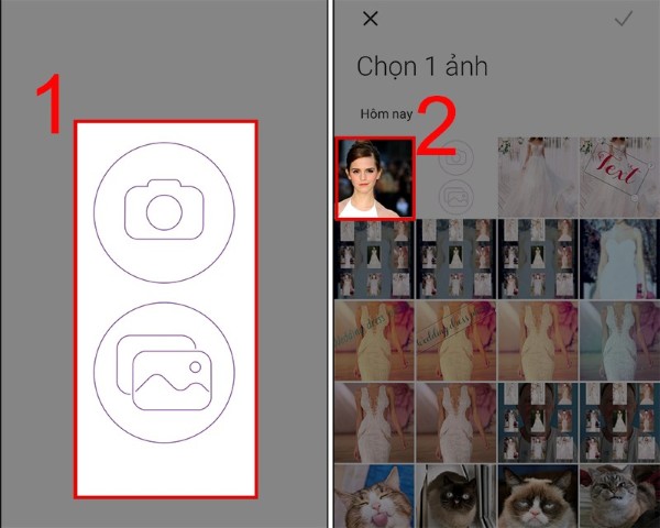 Bước 1: Khởi động ứng dụng Wedding Dress Photo đã cài đặt trên điện thoại. Nếu muốn chụp ảnh mới để ghép, hãy nhấn vào biểu tượng máy ảnh. Trường hợp bạn đã có sẵn ảnh cần sử dụng, chọn biểu tượng thư viện ảnh để tải lên hình từ thiết bị.