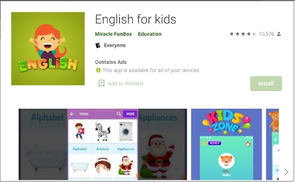 Phần mềm học tiếng Anh English for Kids được rất nhiều phụ huynh lựa chọn cho con em mình với hơn 10.000 lượt tải về trên CH Play. App học tiếng Anh miễn phí cho bé sử dụng nhiều chủ đề quen thuộc với bé như trường học, vui chơi, cuộc sống hàng ngày với hình ảnh sinh động.