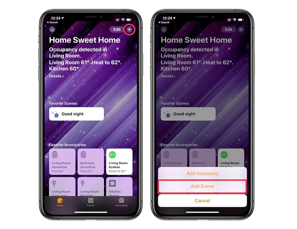 Nếu muốn tạo ngữ cảnh, đầu tiên bạn mở màn hình chính của ứng dụng Nhà > Bấm vào biểu tượng dấu + > Chọn Thêm ngữ cảnh (Add Scene).