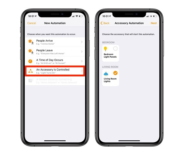 – Khi một phụ kiện được điều khiển: Hành động của một thiết bị khác như bật đèn khi cửa khóa sẽ kích hoạt Tự động hóa.