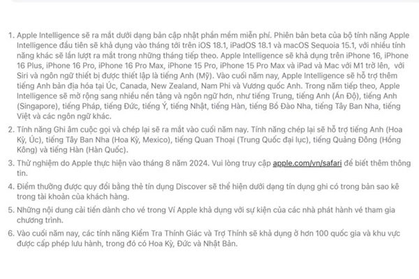 Ngoài ra, trong tháng 12 tới Apple Intelligence sẽ hỗ trợ thêm tiếng Anh được bản địa hóa tại các thị trường khác như Anh, New Zealand, Australia, Canada và Nam Phi. Chưa kể, bộ tính năng AI của Apple cũng sẽ được mở rộng trên nhiều nền tảng và ngôn ngữ hơn kể từ năm tới như Tây Ban Nha, Bồ Đào Nha, Pháp, Italy, Đức, Nhật, tiếng Anh (Singapore), tiếng Anh (Ấn Độ), Trung và tiếng Việt.