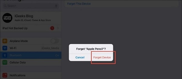 Khởi chạy ứng dụng Setting (Cài đặt) từ màn hình chính của iPad >> Nhấn Bluetooth >> nhấn vào ký hiệu chữ i ở bên phải Apple Pencil 2 >> Nhấn Forget Device (Quên thiết bị này) để hủy kết nối.