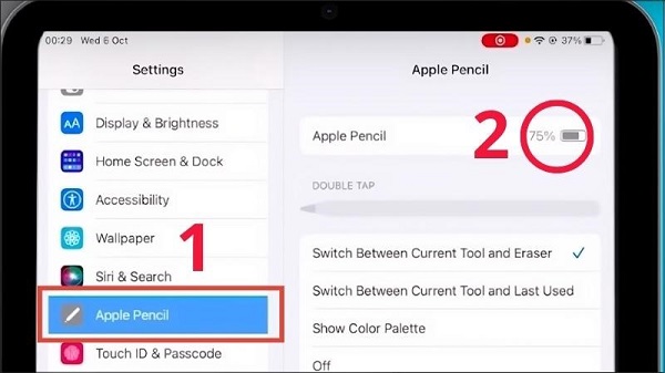 Người dùng hãy vào ứng dụng Setting (Cài đặt) trên iPad >> Chọn Apple Pencil. Lúc này mức pin trên Apple Pencil 2 sẽ được hiển thị ở ngay trên màn hình.