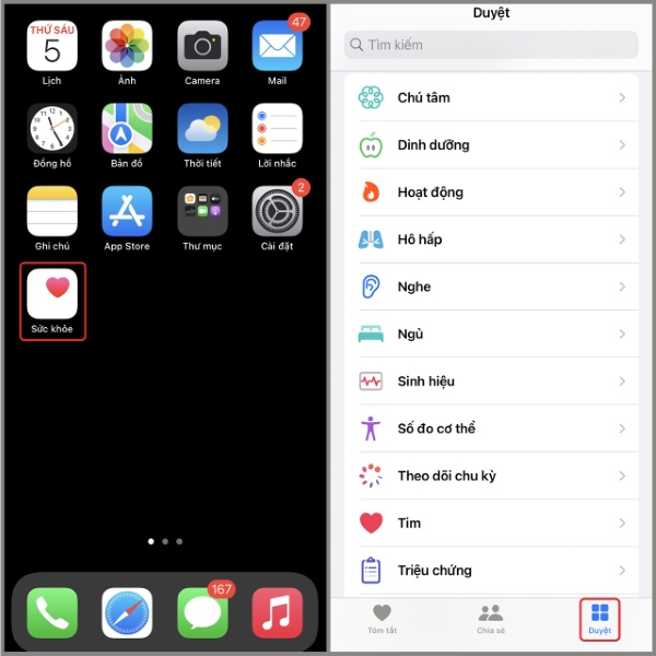 Bước 1: Mở vào ứng dụng Sức khỏe trên điện thoại iPhone > chọn vào mục Duyệt.