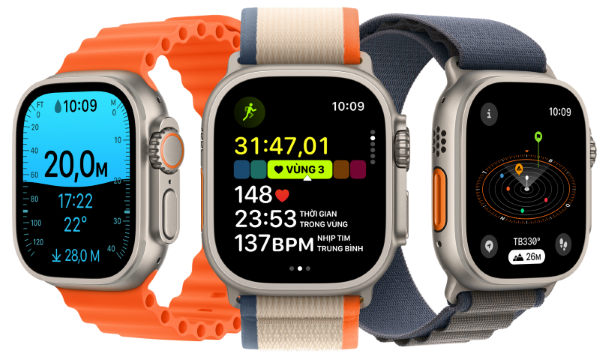 Màn hình Retina 1.92 inch sáng 3000 nits hiển thị rõ ràng ngay cả dưới nắng gắt, hỗ trợ tính năng Always-on tiện lợi. Điểm nhấn là các tính năng theo dõi sức khỏe chuyên sâu như GPS tần số kép, đo nhịp tim, nồng độ oxy trong máu, nhiệt độ da, hỗ trợ leo núi, lặn biển. Thời lượng pin lên đến 36 giờ sử dụng thông minh, kết nối đa dạng với Cellular, đi kèm dây đeo Trail Loop nhẹ, thoáng khí, phù hợp cho chạy bộ, marathon.