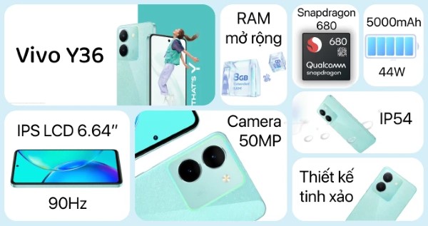 Vivo Y36 là mẫu điện thoại với cấu hình Qualcomm Snapdragon 680 mạnh mẽ trong phân khúc tầm trung. Máy được trang bị RAM 8GB và bộ nhớ trong 256GB, đáp ứng tốt nhu cầu sử dụng đa nhiệm và lưu trữ dữ liệu.