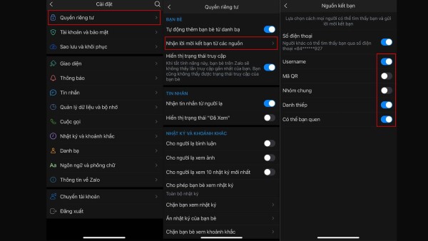 – Quản lý nguồn kết bạn: Cho phép hoặc tắt kết bạn qua số điện thoại, mã QR, username, nhóm chung hoặc danh thiếp để tránh bị làm phiền.