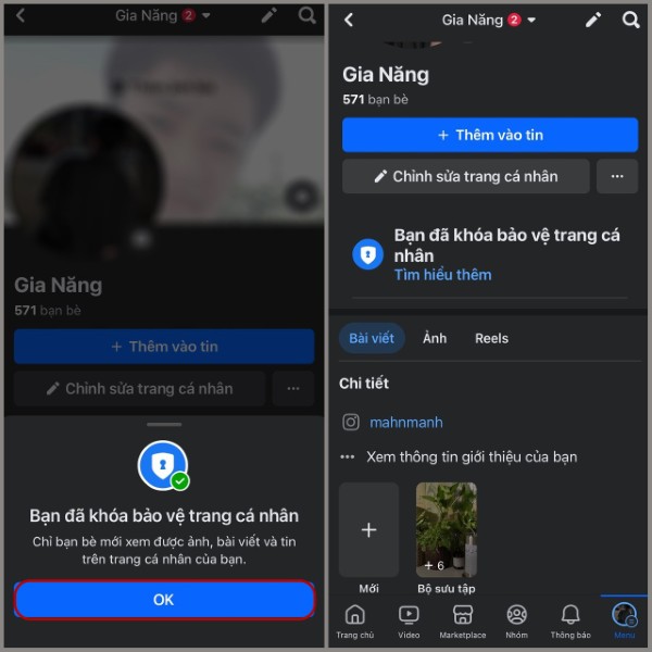 Bước 4: Nhấn OK để hoàn tất. Trang cá nhân của bạn đã được bảo vệ thành công!