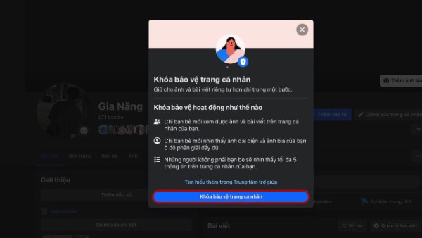 Khi kích hoạt khóa bảo vệ, người lạ chỉ có thể xem ảnh đại diện, ảnh bìa và một số thông tin cơ bản, nhưng không thể xem bài viết, danh sách bạn bè hay bất kỳ nội dung nào khác trên trang cá nhân của bạn.