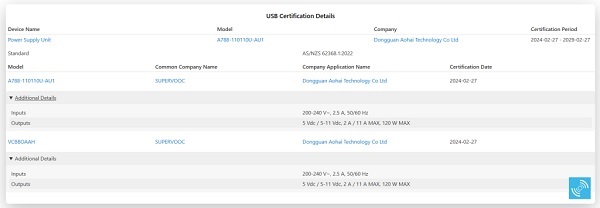 Chi tiết chứng nhận tiết lộ rằng, bộ sạc SUPERVOOC 120W do Dongguan Aohai Technology sản xuất có khả năng cung cấp công suất tối đa 120W (11V, 11A) và hỗ trợ nhiều loại điện áp đầu vào, từ 200 – 240V 50/60Hz, phù hợp với thông số kỹ thuật cung cấp điện của Úc.