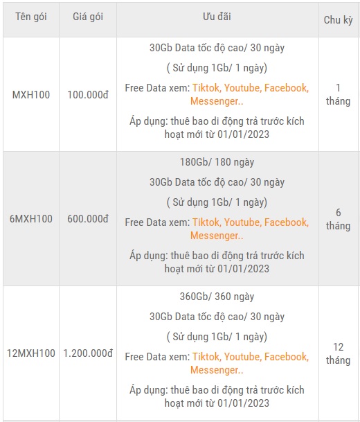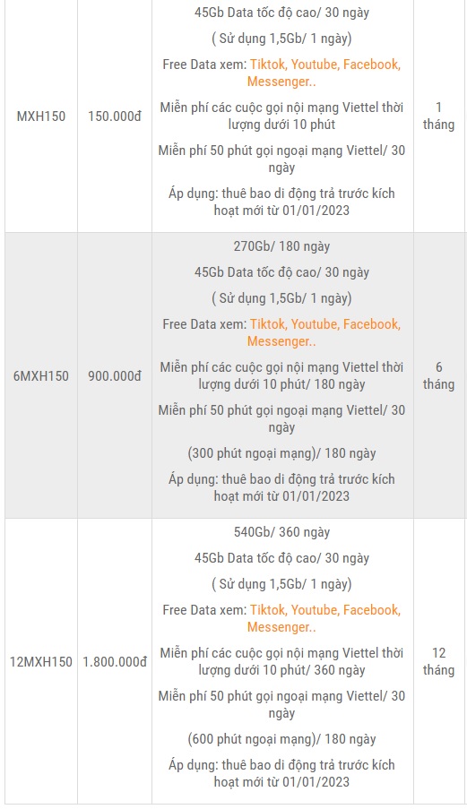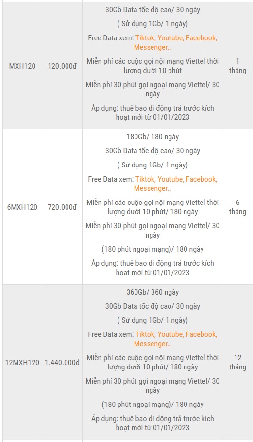 Các gói cước mạng xã hội của Viettel 2023