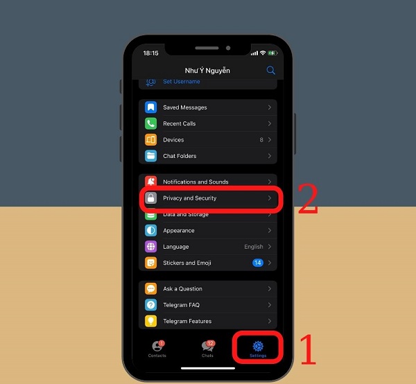 Bước 1: Đầu tiên, người dùng hãy mở ứng dụng Telegram trên điện thoại iPhone lên >> Nhấp chọn mục Settings ở góc bên phải màn hình >> Nhấn vào mục Privacy & Security.