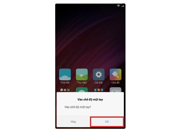 Để kích hoạt cài đặt chế độ một tay trên điện thoại Xiaomi, người dùng có thể thực hiện như sau: Sử dụng ngón tay tiến hành chạm và giữ vào phím home ảo và vuốt sang vị trí trái hoặc phải tương ứng với tay sử dụng trong chế độ một tay. Sau khi thực hiện thành công, ứng dụng sẽ hiển thị nội dung thông báo xác nhận bạn có quyền truy cập chế độ một tay hay không. Chọn vào OK để truy cập, hủy để thoát menu thông báo trên màn hình.