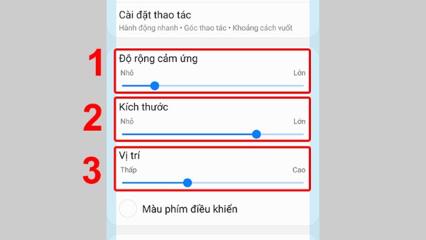 Để tùy chỉnh các thông số cụ thể của độ rộng cảm ứng, kích thước, vị trí của tay cầm thì bạn chỉ cần thay đổi qua lại các thanh trong các mục tương ứng của ứng dụng.