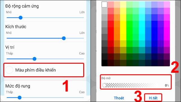 Để thay đổi mức độ trong suốt, bạn chọn vào Màu phím điều khiển > Thay đổi qua lại ở vị trí thanh Độ mờ > Sau đó nhấn chọn vào hoàn tất.