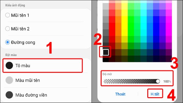 Bước 2: Nhấn vào Tô Màu > Chọn tiếp vào màu sắc yêu thích > Điều chỉnh Độ mờ > Nhấn vào mục hoàn tất.