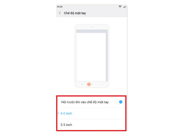 Ở tùy chọn này, cho phép người dùng tùy chỉnh kích thước của màn hình hiển thị ở chế độ một tay trên điện thoại Xiaomi bao gồm 2 tùy chọn màn hình có kích thước 3.5 inch hoặc lớn hơn mức 4 inch.