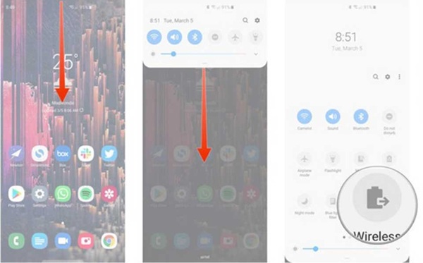 Bước 2: Kích hoạt tính năng Wireless PowerShare bằng cách vuốt màn hình xuống từ cạnh trên để mở thanh thông báo > Nhấn chọn biểu tượng Wireless PowerShare > Tính năng này được bật là khi biểu tượng sáng lên.