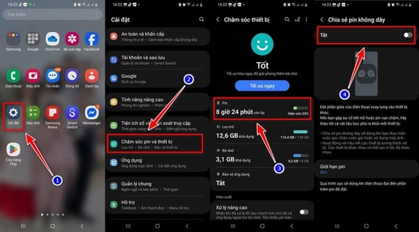 Ngoài ra, bạn cũng có thể truy cập ứng dụng Cài đặt > Bấm chọn vào mục Chăm sóc pin và thiết bị > Chọn Pin > Chọn Chia sẻ pin không dây, sau đó gạt công tắc sang phải để bật tính năng Wireless PowerShare.