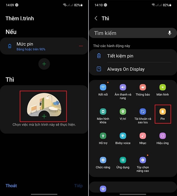 Sau đó, bạn bấm chuyển qua tab Thêm lịch trình > Bấm vào dấu + tại mục Nếu > Chọn mục Mức pin và nhập % pin mà mình muốn ngắt tự động > Chọn mục Bằng hoặc trên > Bấm vào nút Hoàn tất.