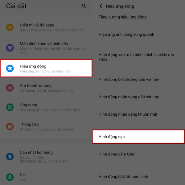 Bước 1: Mở ứng dụng Cài đặt trên điện thoại Vivo Y100 của bạn. Sau đó, chọn “Hiệu ứng động” từ menu. Tiếp theo, chọn “Hình động sạc”.