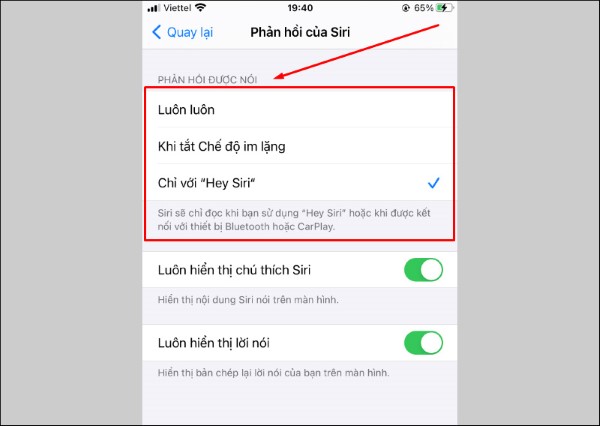 – Luôn luôn: Siri luôn nói ra kết quả và hiển thị trên màn hình.