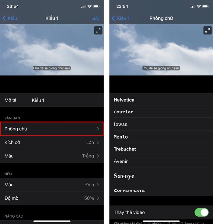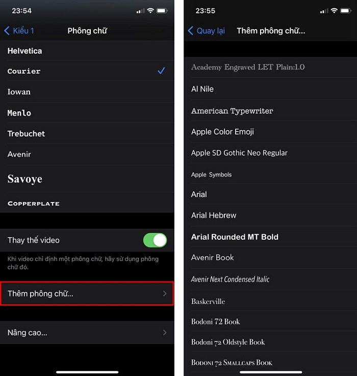 Bước 4: Trong mục “Phông chữ” bạn còn có thêm một số tùy chọn khác như “Thay thế video” (là khi video chỉ định một phông chữ sẽ sử dụng phông chữ đó). Hay “Thêm phông chữ và Nâng cao” (Chọn phông chữ khi nội dung yêu cầu hiển thị một kiểu phông chữ cụ thể.)