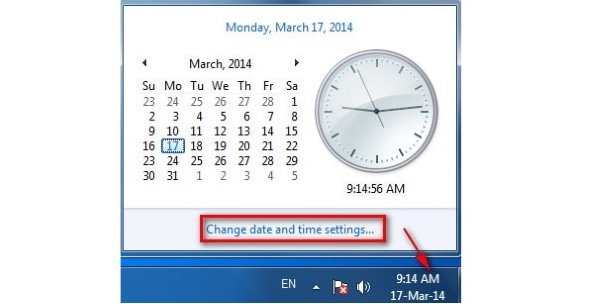 Bước 1: Bạn nhấn chuột vào biểu tượng ngày, tháng dưới thanh Taskbar phía bên phải màn hình > chọn Change date and time settings để tiến hành chỉnh đồng hồ trên Win 7.