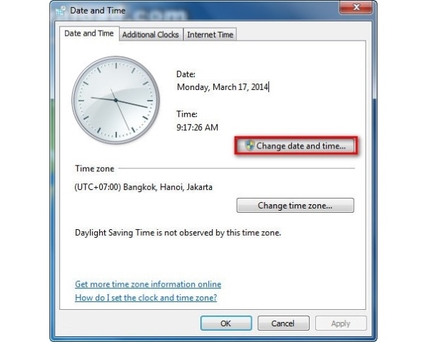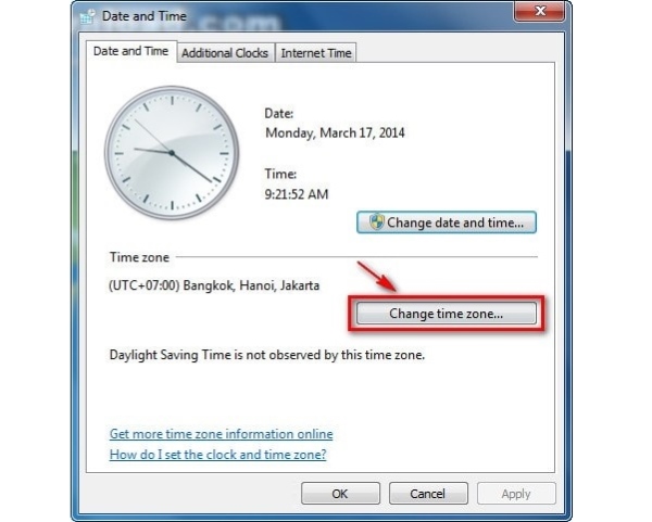 Bước 4: Người dùng có thể thay đổi múi giờ bằng cách nhấn chọn vào Change time zone… để hiển thị múi giờ đúng của khu vực mình đang ở.
