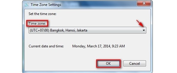 Bước 5: Khi cửa sổ Time Zone Settings hiện ra, bạn chọn múi giờ tại mục Time zone > nhấn OK để hoàn thành.